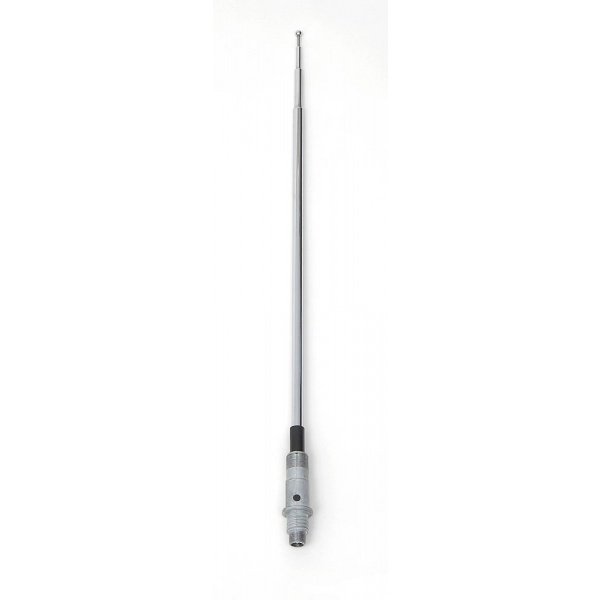 The mast section of the antenna consists of four round chrome sections, three telescoping sections, and one fixed section, with an approximately 1/4" ball-shaped tip at the end of the mast. The overall height in a lowered position from the bottom of the black plastic body gasketto the top of the ball is approximately 15".