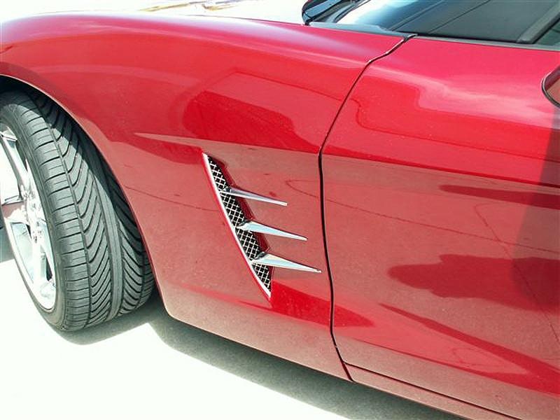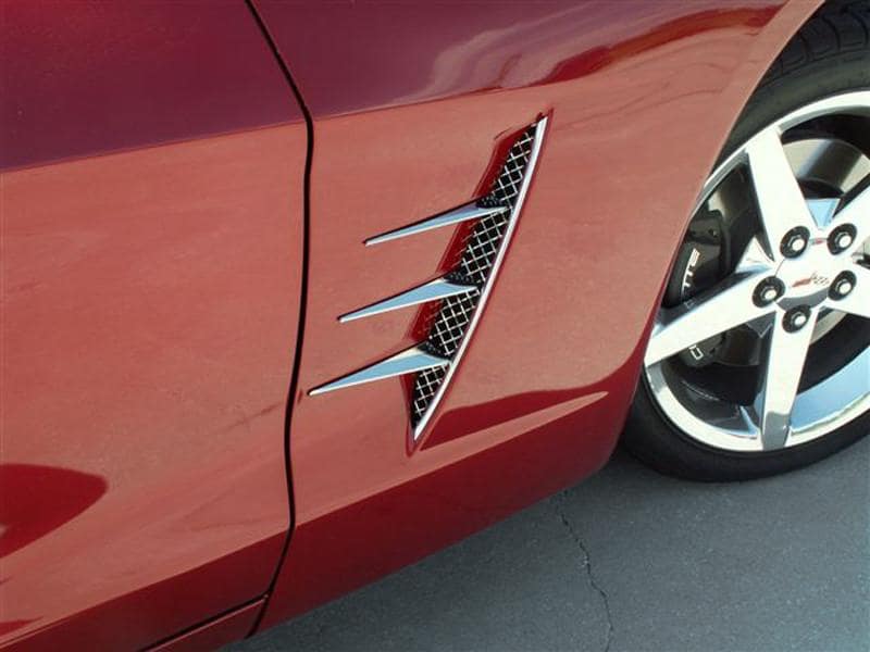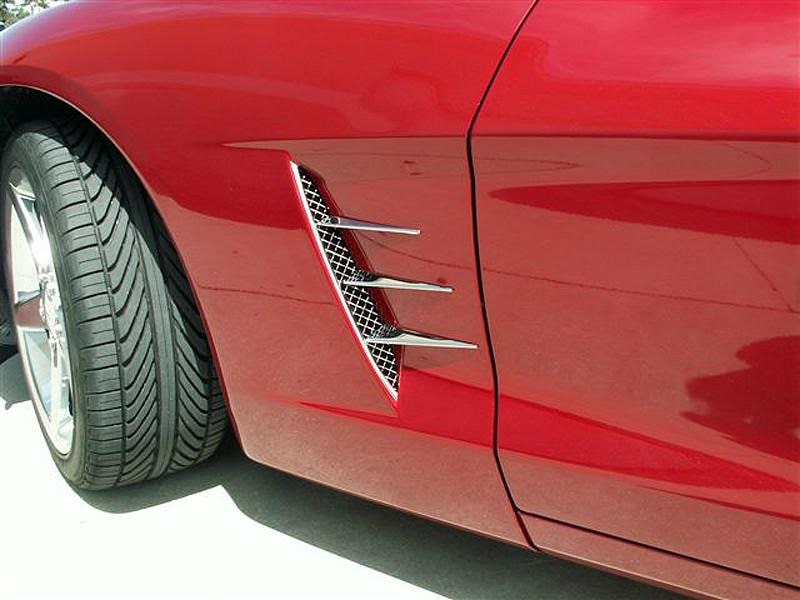 Dress up your Corvette with our Laser Mesh Stainless Steel Side Vents with Spears. These trim pieces are designed to fit all 2005-2012 C6 Corvettes in the side fender vents and adds a clean stylish look to your Corvette exterior.