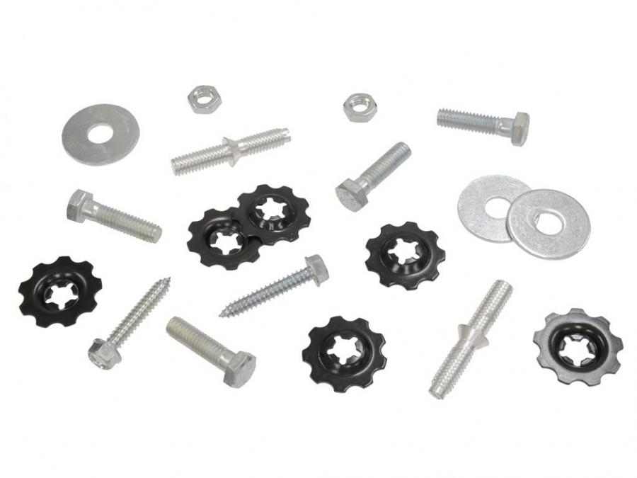This kit includes all the hardware needed to mount your front vent window frame and track assembly to the C2 Corvette convertible door. Included in the kit are 4 Bolts, 2 screws, flat washers The 2 special lower mounting studs with nuts and 6 correct internal/external large toothed star washer are also included