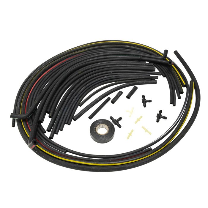Complete hose kits include correct size color striped hoses with raised ribs plus T connectors, harness tape, and routing diagram.