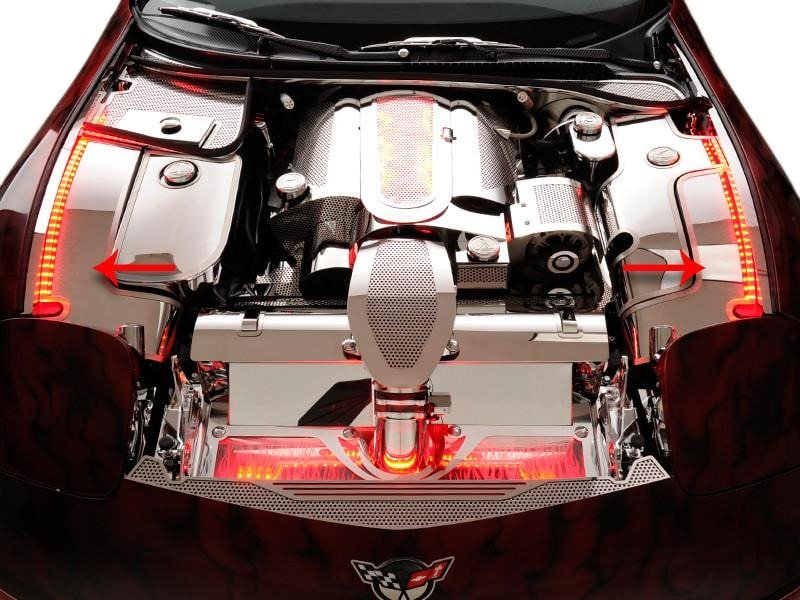 Dress up your Corvette with our Polished - Stainless Steel, Inner Fender Cover Extensions. These trim pieces are designed to fit all 1997-2004 Corvettes on the inner fender and add a clean stylish look to your Corvette engine bay. Compliments our (5) piece Hood Insert Set - 033002.