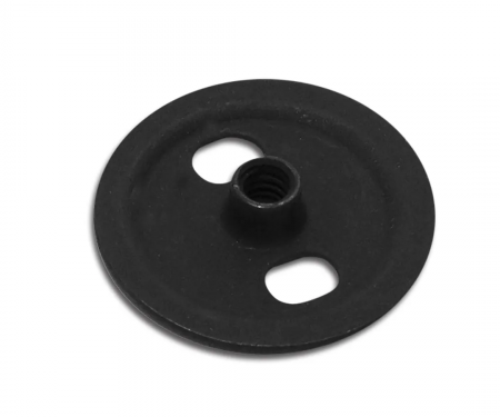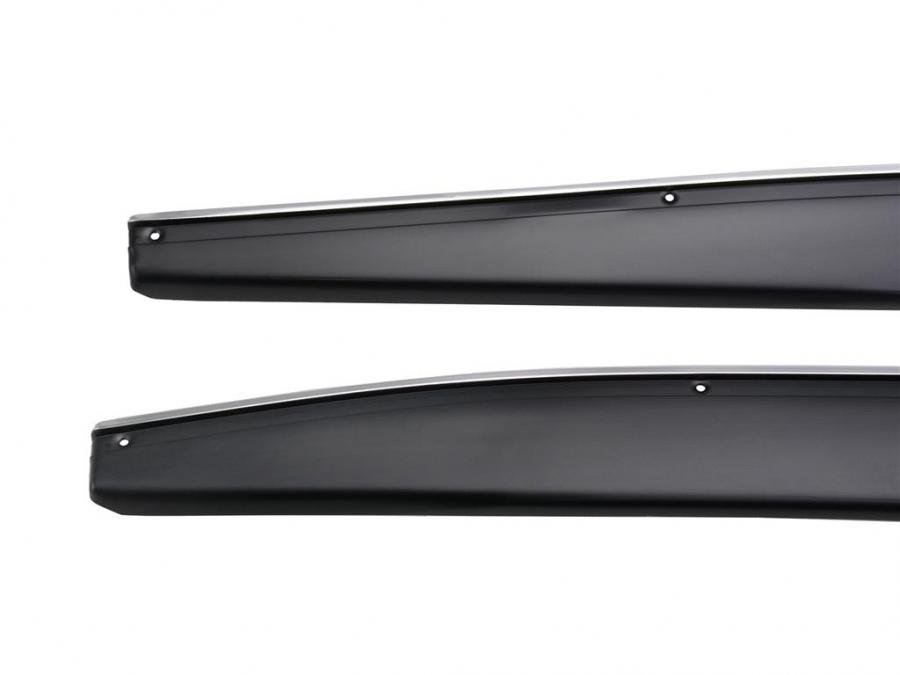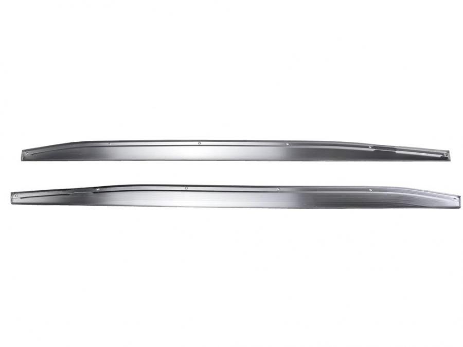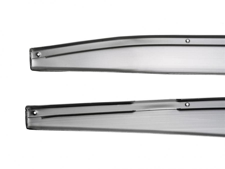 These side fender lower rocker trim panels are black painted aluminum with a clear anodized upper edge. The attachment screws run below the upper edge. It is attached to the body with black oxide, Phillip’s oval head screws.