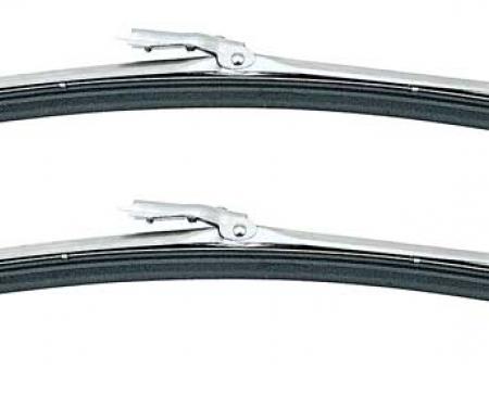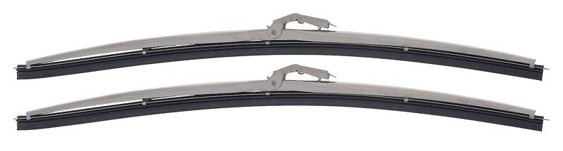 OER reproduction "Anco style" wiper blades for various GM, GMC, Chrysler, Plymouth, Dodge, AMC, Ford, and Studebaker models. Features a polished stainless steel blade with correct rubber insert. Designed after the "Anco" brand blades of the period. Fits wiper arms with "Wide Bayonet Style 1/4" (7mm)" ends. Low silhouette design resists wind-lift at high speeds. Sold as a pair. Measures 15" in length.