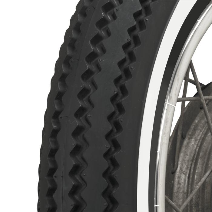 This product features a genuine narrow whitewall sidewall style. This means that the bright white rubber is added directly to the tire sidewall during initial construction of the carcass, resulting in a truly integrated, high-quality product after vulcanization. When we reference "narrow whitewall" tires, we typically mean a whitewall that measures less than two inches, but it can also mean a whitewall that does not reach all the way into the bead. Narrow whitewall tires are popular for many cars built in 1960's all the way into the 1990's.