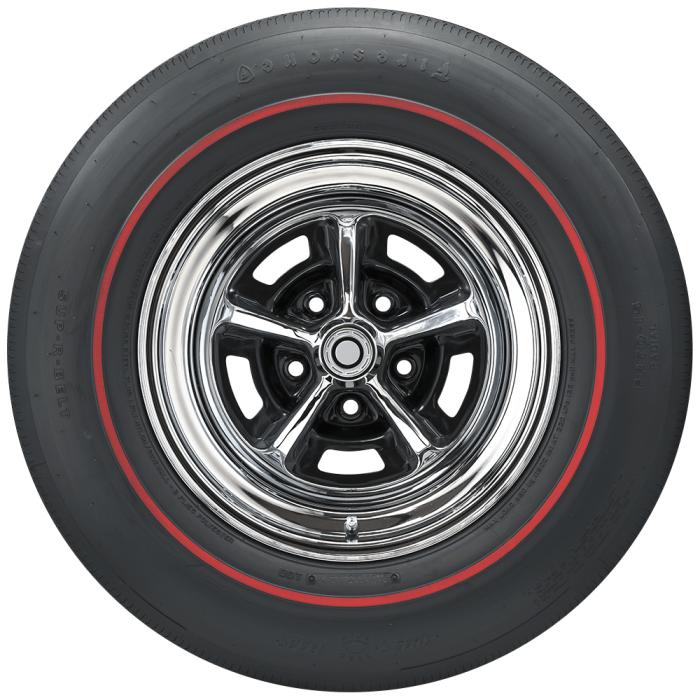 This product features a genuine redline sidewall style, sometimes known as a red stripe, due to the thin 3/8-inch strip rubber. This means that the red rubber is added directly to the tire sidewall during initial construction of the carcass, resulting in a truly integrated, high-quality product after vulcanization. Redline tires hit the American automobile market in 1964 with the introduction of the Pontiac GTO and remained a popular muscle car tire until around 1970. Dual redline tires (two red stripes) were an option on Ford Mustangs, and are now reproduced in original bias ply, bias look radial as well as radial construction. Choose the redline that best fits your application.