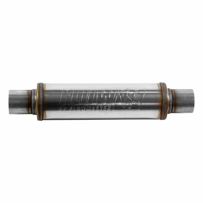 Flowmaster's FlowFX series mufflers are for the enthusiast who is looking for an economically priced performance muffler that delivers a moderate sound level and tone, both inside and outside the vehicle. The large straight-through smooth core offers up a different sound than that typical "chambered" sound that Flowmaster has become famous for. These new FlowFX mufflers have a compact 4.00 inch diameter round body that will fit nicely on just about any application and feature a fully welded 409S stainless steel case for increased durability.