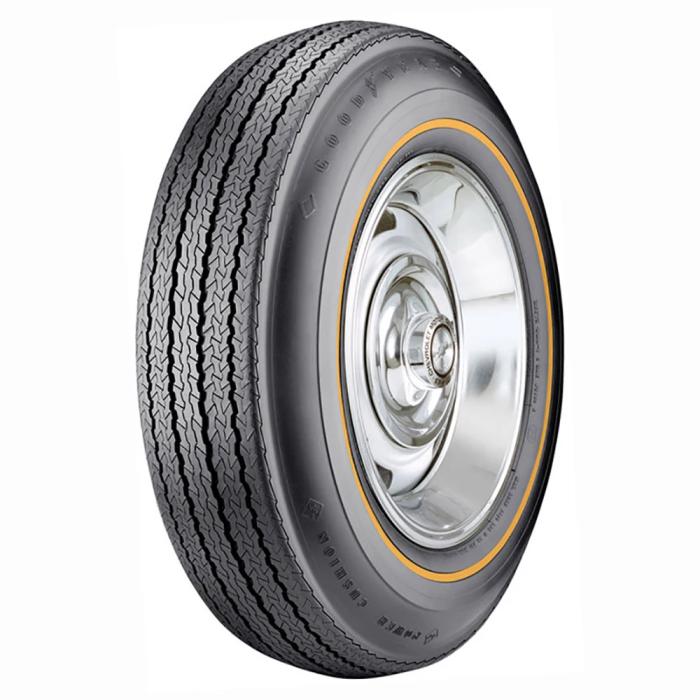 • These Classic Goodyear tires are drop shipped directly. Please allow additional shipping time. Tire mounted on wheel for demonstration purposes only. Wheel and other accessories are not included. Please note that dimensions listed (tread width, section width and overall diameter) are non-scientific and based on an inflated tire, mounted to a wheel. Dimensions may vary due to rim width and inflation pressure.