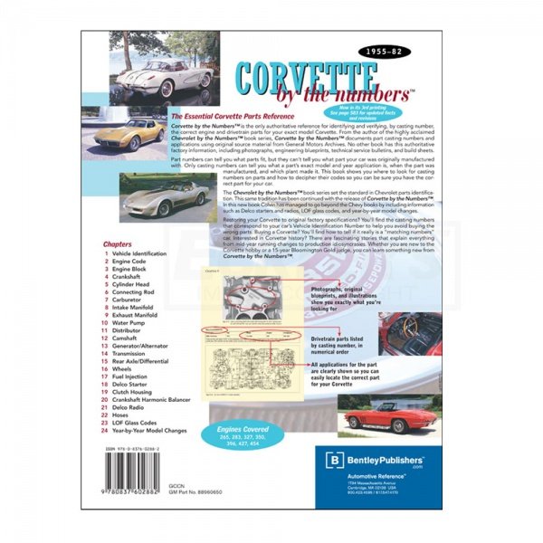 Whether you're restoring your Corvette to original factory specs or you're looking for a matching numbers car, this authoritative reference will allow you to identify and verify correct Corvette V-8 engine and drivetrain parts for your model, by casting numbers. You'll learn where to look for these casting numbers and how to decipher their codes to ascertain that you have the correct part for your car. Neverbefore- seen factory information includes photographs, engineering blueprints, technical service bulletins and build sheets. Softcover, 8 3/8" x 11" with 596 pages plus 1000+ photos, illustrations and diagrams.