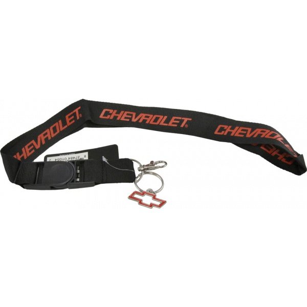 100% Nylon Chevrolet Name On Lanyard Key & Badge Holder The Chevy bold Lettering dominates this cool and practical key and badge lanyard that will impress Chevrolet fans everywhere. Crafted of 100% nylon, this sturdy lanyard features a detachable key and badge fob. Also includes a cool red epoxy bow tie key chain.