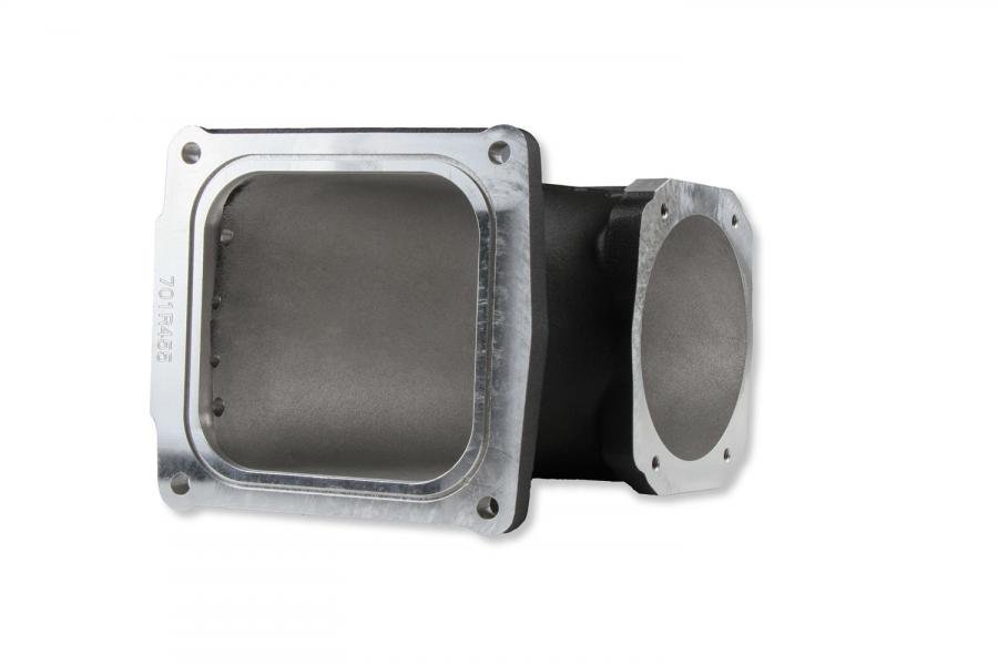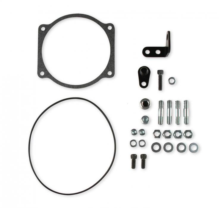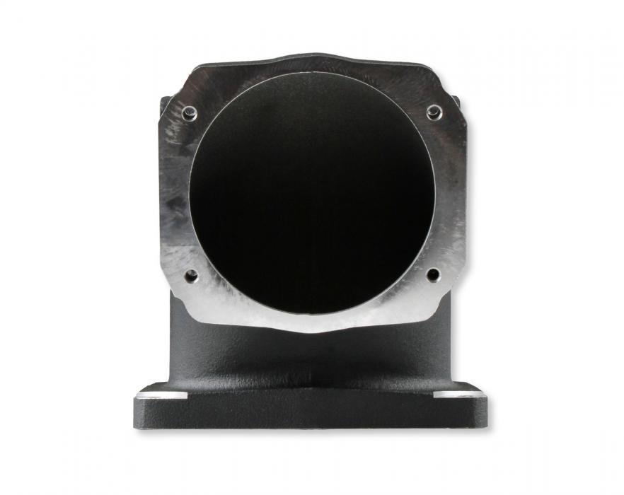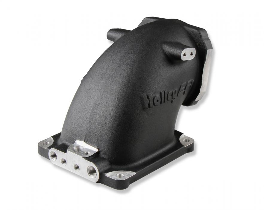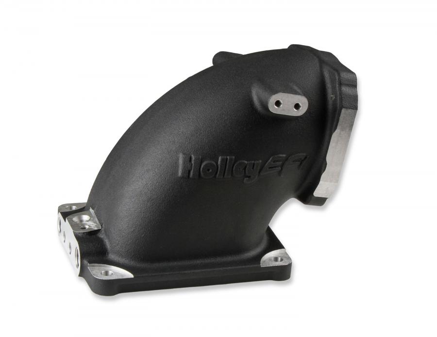 These cast aluminum EFI intake elbows allow the use of GM LS throttle bodies on any intake manifold w/ the 4500 mounting flange. Our design incorporates an optimized transition from the throttle body to the intake plenum for maximum airflow and distribution. Dual throttle cable mounting bracket bosses are included while the 4500 flange pattern allow the elbow & throttle body to be mounted forward, sideways, or rearward. The throttle bracket is included. HOLLEY EFI,Features (4) vacuum ports, MAP sensor port, machined / port matched to 4500 gasket, and 100° throttle body angle for extra hood clearance. Includes billet MAP sensor port cover, gaskets & hardware. The port design spacing will also allow a transducer to be used if a MAP sensor is not needed. The intake flange has an o-ring groove for a positive flange seal and the o-ring is included as well.