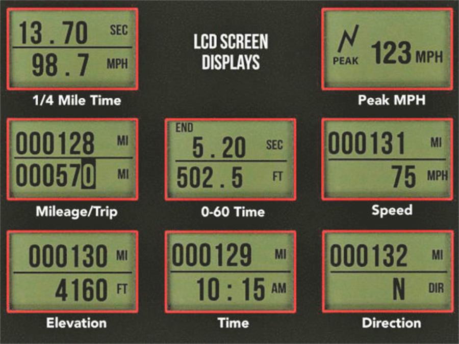 - 0-160 MPH range with multi-function LCD display screen including ¼ mile time, 0-60 time, current speed, mileage/trip odometer, direction, and time of day
