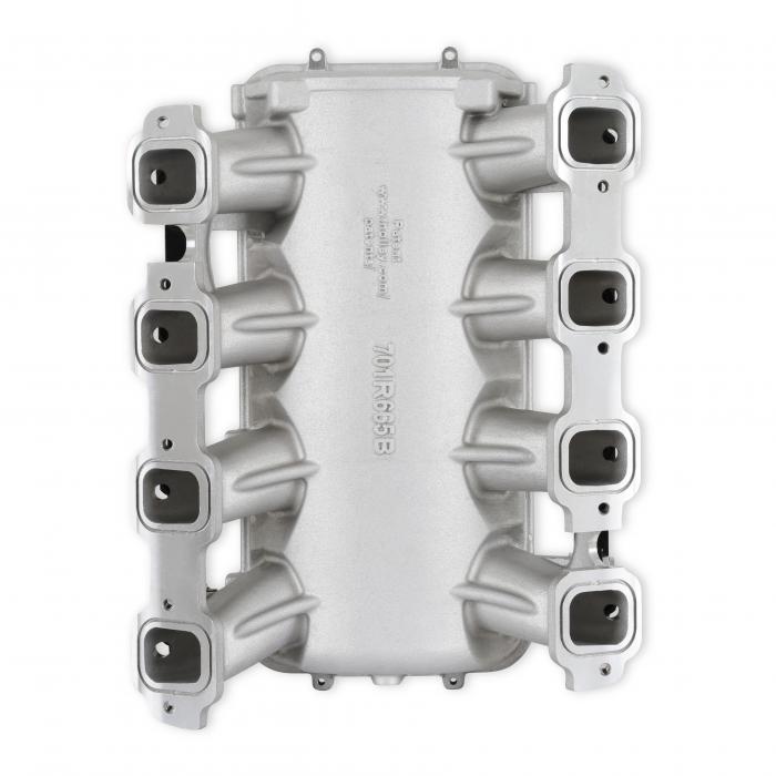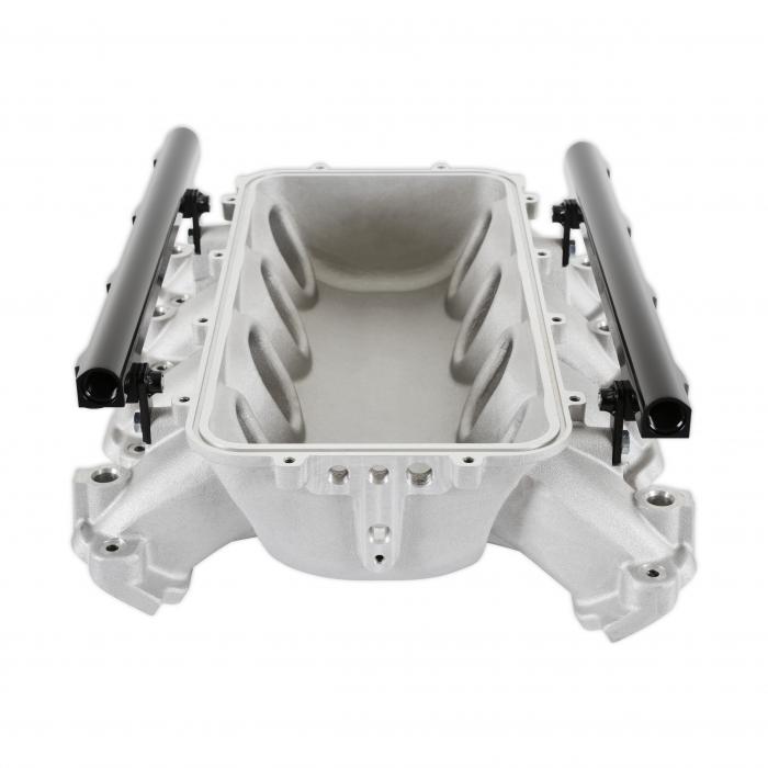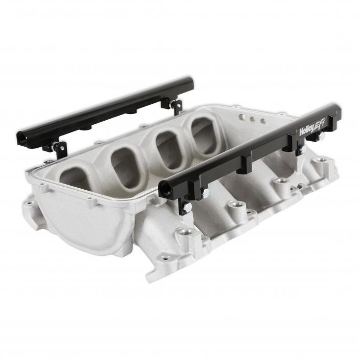 The Holley GM Gen V LT Lo-Ram intake manifold kits are designed for GM Gen V LT engines equipped with GM LT cylinder heads. These intake manifolds will work with OE or aftermarket cylinder heads. The Lo-Ram intake manifolds are designed for forced induction (supercharged or turbocharged) engine applications with peak power at 7,000-8,000 rpm depending on the application. The standard plenum top throttle body flange has a 105 mm opening to work with throttle body part number 112-581 or similar models. The top-feed plenum base intake manifold is designed with a reduced overall height to fit under a stock or mildly modified hood. The Lo-Ram provides a low profile modular intake manifold suitable for use with plenum mounted air-to-water intercoolers for boosted applications. Various Hi-Ram plenum top options are available to compliment the top-feed base intake manifold kits and fabrication flanges are offered to aid the fabrication of plenum tops for custom installations. Available for OE direct fuel injection only and with port fuel injection provisions. For the port fuel injection option, the high volume -8AN fuel rail kit includes hardware and brackets to accommodate long (usually standard length) fuel injectors or short (such as Pico, or LS7) fuel injectors.