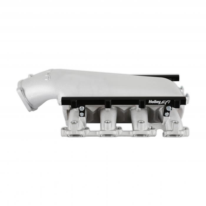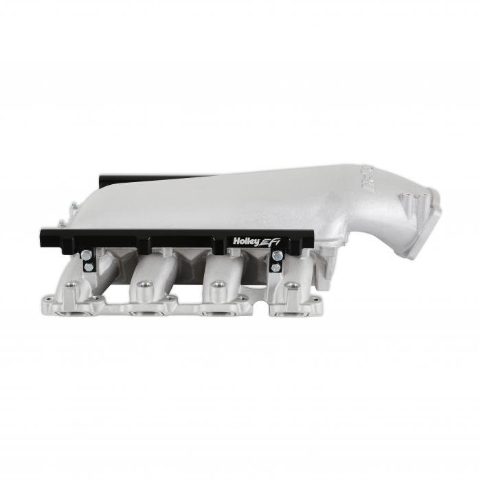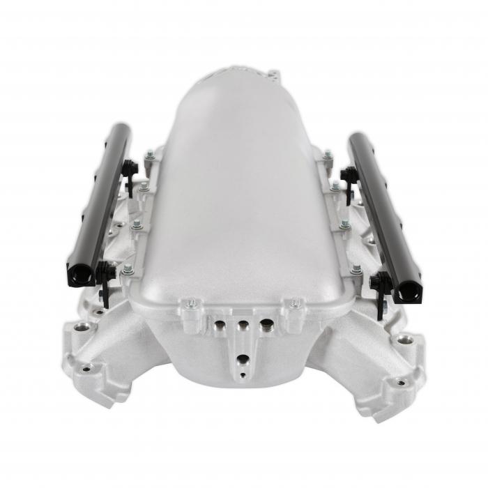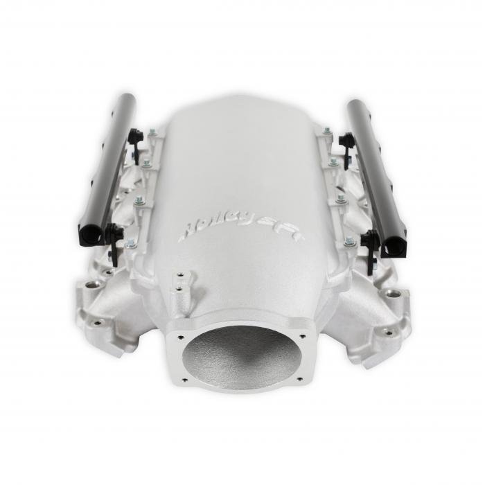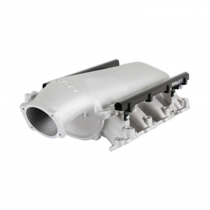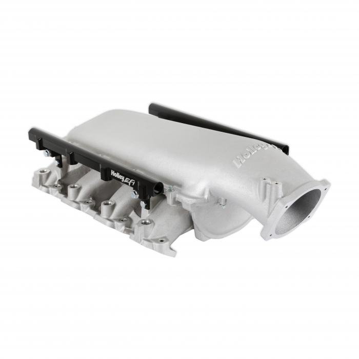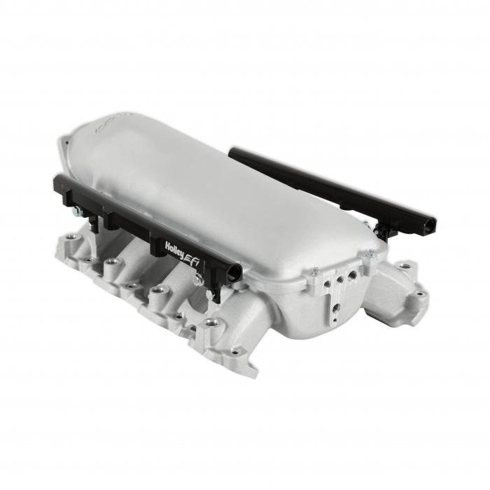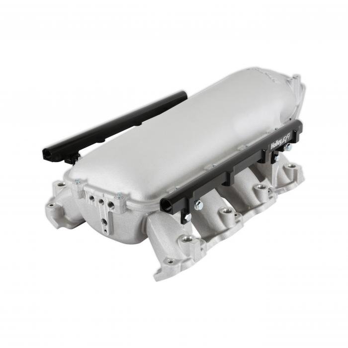 The Holley GM Gen V LT Lo-Ram intake manifold kits are designed for GM Gen V LT engines equipped with GM LT cylinder heads. These intake manifolds will work with OE or aftermarket cylinder heads. The Lo-Ram intake manifolds are designed for forced induction (supercharged or turbocharged) engine applications with peak power at 7,000-8,000 rpm depending on the application. The standard plenum top throttle body flange has a 105 mm opening to work with throttle body part number 112-581 or similar models. The top-feed plenum base intake manifold is designed with a reduced overall height to fit under a stock or mildly modified hood. The Lo-Ram provides a low profile modular intake manifold suitable for use with plenum mounted air-to-water intercoolers for boosted applications. Various Hi-Ram plenum top options are available to compliment the top-feed base intake manifold kits and fabrication flanges are offered to aid the fabrication of plenum tops for custom installations. Available for OE direct fuel injection only and with port fuel injection provisions. For the port fuel injection option, the high volume -8AN fuel rail kit includes hardware and brackets to accommodate long (usually standard length) fuel injectors or short (such as Pico, or LS7) fuel injectors.