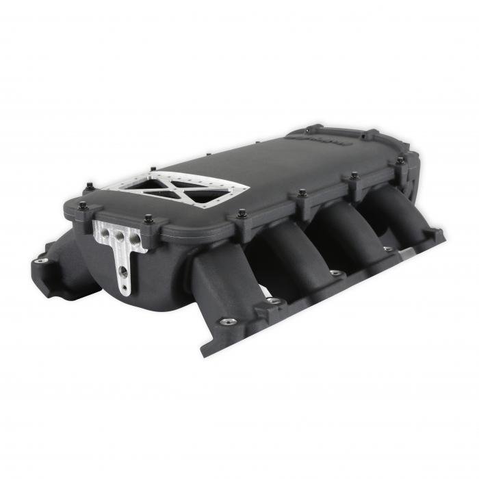 The Holley GM Gen V LT Ultra Lo-Ram intake manifold kits are designed for GM Gen V LT engines equipped with GM LT cylinder heads. These intake manifolds will work with OE or aftermarket cylinder heads. The Ultra Lo-Ram intake manifolds are designed for forced induction (supercharged or turbocharged) engine applications with peak power at 7,000-8,000 rpm depending on the application. The front entry throttle body flange has a 105mm opening to work with throttle body part number 112-581 or similar models. The front-feed base intake manifold is designed with a lower overall height to fit under a stock or mildly modified hood. The Ultra Lo-Ram provides a very low-profile modular intake manifold along with various fabrication flanges to aid the fabrication of special throttle body adapters or inlet ducts for custom installations. Available for OE direct fuel injection only and with port fuel injection provisions and a burst panel flange options. For the port fuel injection option, the high volume -8AN fuel rail kit includes hardware and brackets to accommodate long (usually standard length) fuel injectors or short (such as Pico, or LS7) fuel injectors.