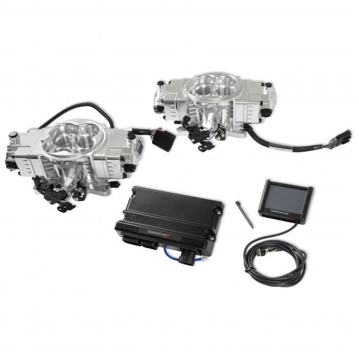 The Terminator X Stealth 4150 2x4 EFI systems from Holley features 8, 100LB/HR Fuel Injectors capable of supporting up to 1500 HP naturally aspirated or 1250 HP on forced induction applications. The Terminator X ECU is capable of fuel map self-learning and ignition timing control, improving idle stability, drivability, and wide-open throttle horsepower.