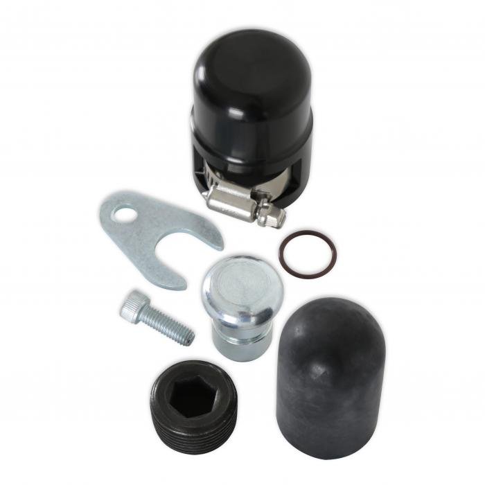 - Special rubber cap with clamp-on aluminum billet cover – blocks off the front port