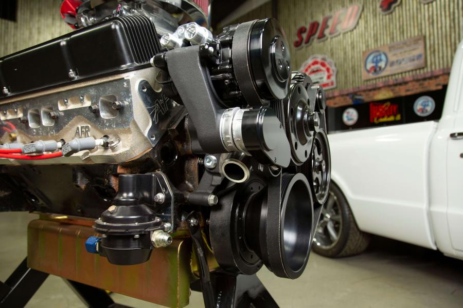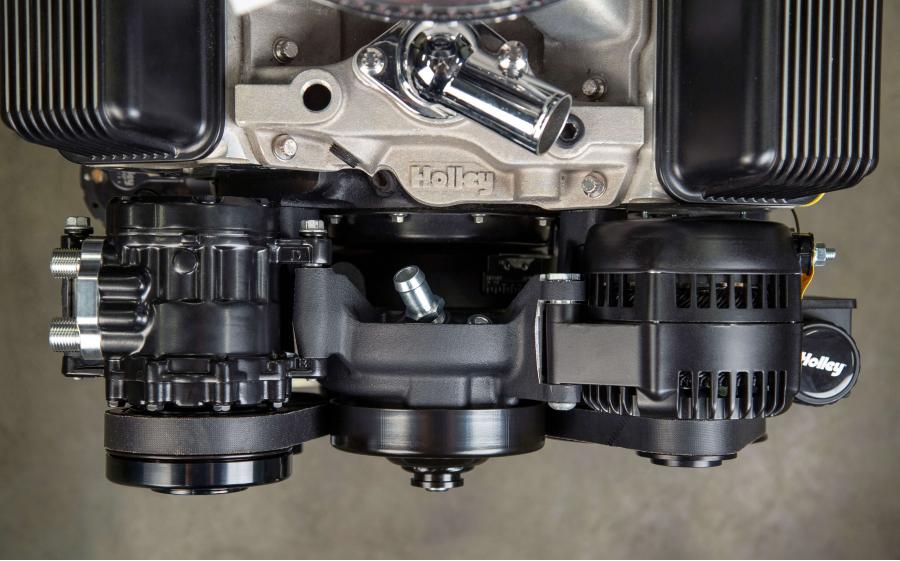 Holley's Mid-Mount accessory drives are now available for your small block Chevrolet engines! The revolutionary system does what no other accessory bracket system has done… GETS RID OF THE BRACKETS! The Mid-Mount complete accessory system has all accessories pulled in tighter than other accessory drives. At the heart of the system is a "bracketless" design, where the accessories bolt directly to the water pump for a clean, integrated form. The design offers superb engine visibility to show off your horsepower, not your accessories. The Holley designed alternator is just as innovative. This premium alternator utilizes 6-phase technology as found on the C7 Corvette. The water pump also shares its design efficiencies with that of the C7 Corvette. The compact and reliable SD7 A/C compressor and Type II P/S pump with baffled reservoir are also integrated. The water pump design incorporates optional side or top heater ports. The top thermostat bypass and heater ports are recessed into the manifold. So if you don't need them, you don't see them! When we say "complete", we mean complete. The Mid-mount system comes with everything you need. All accessories are included; the water pump, A/C compressor, Alternator, and P/S pump with reservoir. All pulleys and the belt are supplied. Even A/C line adapter, heater hose adapters, power steering to -6 AN hardline, and the alternator plug/harness are included. Easy assembly was a priority during the entire development of this accessory solution. Color graphical instructions walk you through every step of the ultra-easy installation. Patent - www.holley.com/patents/