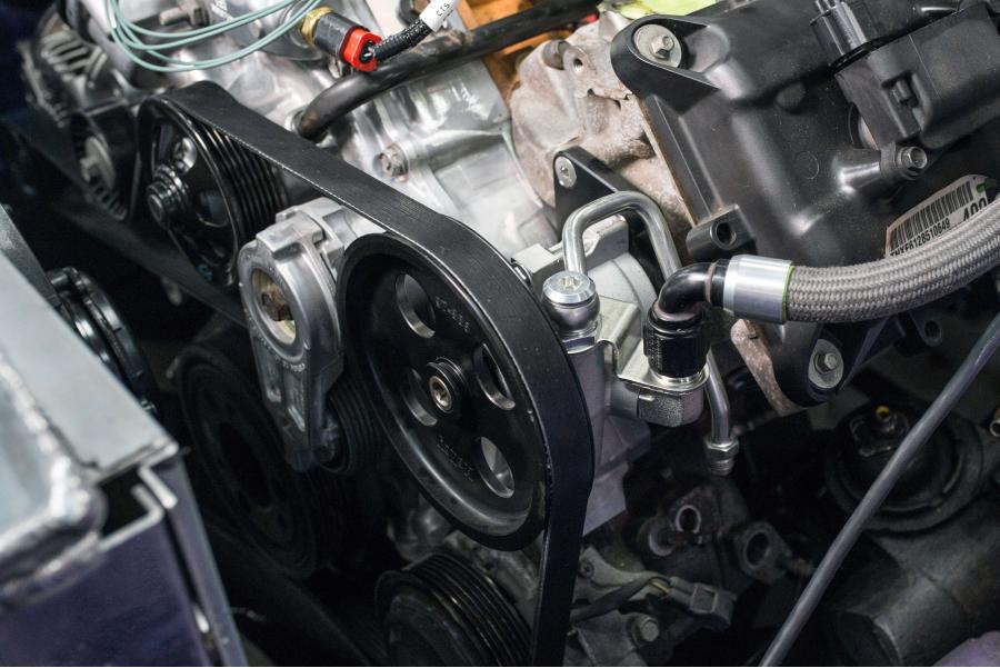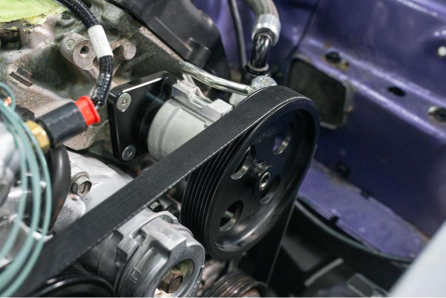 Mounting bracket bolts onto the engine w/ 3 tapped holes on the front of the left side cylinder head (some vehicles came from the factory with electric power steering and may not have the 3 tapped holes in the front of the cylinder head).