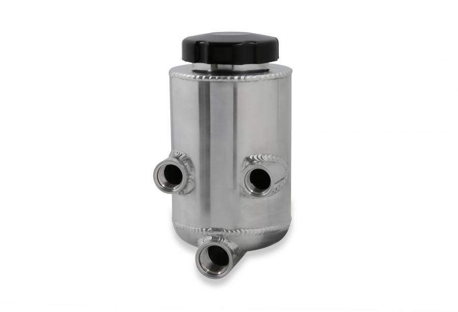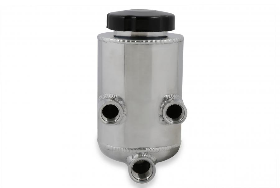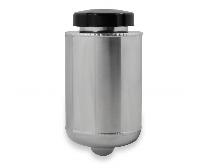 Holley's remote mounted power steering reservoirs are ideal for applications that can not fit a pump mounted reservoir. These lightweight aluminum reservoirs have an internal baffle and air separator to keep the fluid from getting foamy or overflowing. Choose from two styles of reservoirs - Use 198-211 (polished aluminum finish) for custom & racing applications (fabricate mount or use clamps for mounting), or 198-212 has a black finish, and includes mounting bracket. Reservoirs include AN fittings.