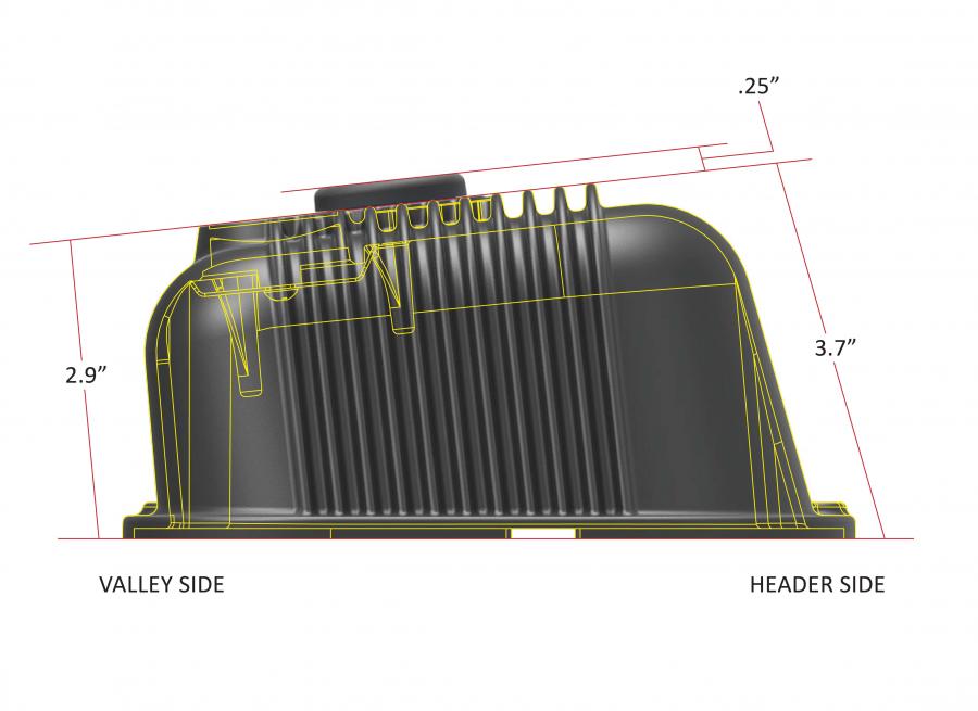 • 2.5” clearance at lowest internal wall (valley side) and 3” internal clearance (header side) with cast-in oil drippers