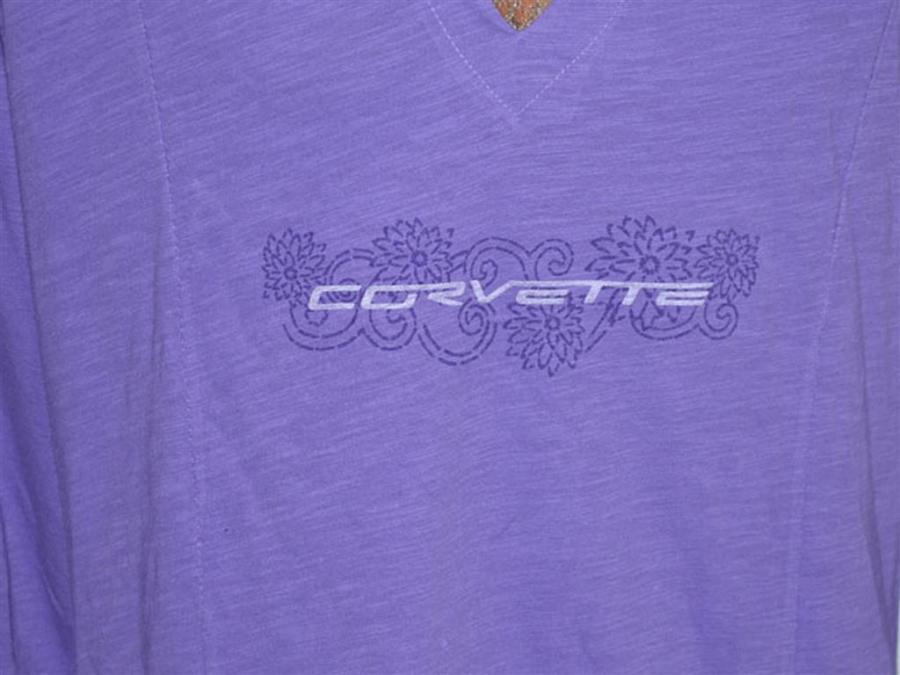 100% cotton slub jersey. V-neck with hood. Princess seams with side seam pockets. 28" tunic length. Features tonal floral design with distressed Corvette script.