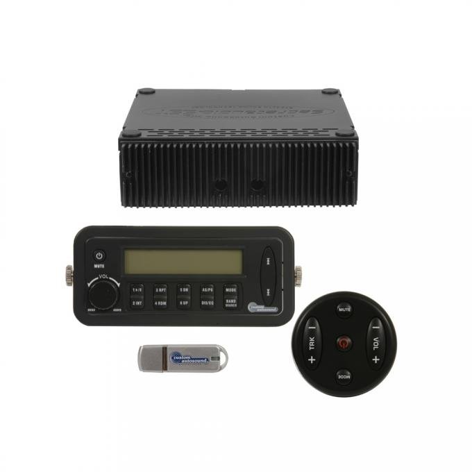 Hideaway 200 Watt AM/FM CD controller with USB MP3/WMA Flash Drive, iPod interface and more. Featuring “RF” (radio frequency) remote control. Ideal for Streetrods, Classics, Customs or any Vehicle! Leave original radio intact! The tuner/amplifier unit (black box) can be hidden out of site (under seat, dash or trunk) . We have even included the iPod docking cable (iPod not included).