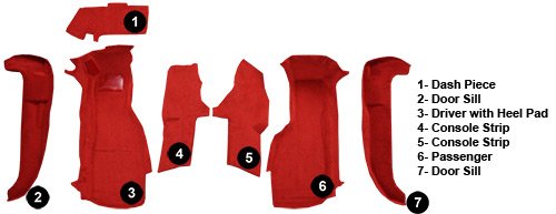 • Fronts dash pieces and console pieces. The 94-96 Corvette does not have carpet on the door panels. Includes velcro for installation.