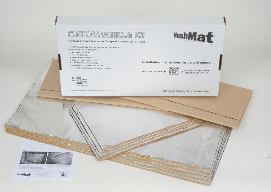 Comfort and style are earmarks of your vehicle. HushMats sound deadening and thermal insulation enhances the experience with the easiest to install sound deadening material. Your vehicle is fun to drive, but the engine gets hot. Your engine, headers, manifold and exhaust generate tremendous heat that transfers to the metal firewall and floor and this heats up your vehicle interior. This also forces your AC system to work harder to reduce and maintain comfortable temperatures inside your vehicle. HushMat proprietary USA manufactured chemistry makes the automotive heat shield dissipate this heat, insulating your interior, and improving the load on your HVAC system which makes your vehicle significantly cooler in the summer and warmer in the winter. HushMat is proven in an independent study to lower this temperature by over 40 percent. When you drive on the highway at approximately 65 miles per hour the interior of your vehicle is approaching 80 to 90 decibels of noise. That is like placing a vacuum cleaner or garbage disposal running on your passenger seat. HushMat uses a specially designed sound deadening mat to REDUCE the noise level in your vehicle by up to 15 decibels. When you drive on the highway and then exit. At the end of the exit ramp the first thing you do is turn down your radio or music because it was too loud. The same is true when speaking on a cell phone or through blue tooth. Eliminate the road noise with HushMat and enjoy your conversation without yelling over the noise. HushMat sound deadening mat leads the automotive sound deadening industry in ease of installation. It is also the number 1 Rated in performance. Hushmat is packaged specifically for your vehicle to provide 100 percent insulation coverage, there are no holes in the material and no puzzle pieces to put together. Treat your firewall, doors, floor, tunnel, rear wheel wells, trunk floor and roof with this complete kit.