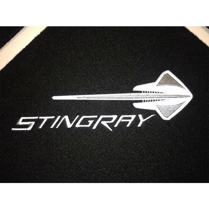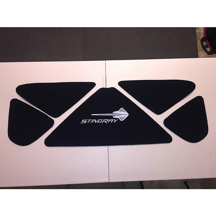 Five piece kit for the C7 trunk lid.  Black carpet with the Stingray emblem monogrammed on the center insert.  Many customers purchase this as a replacement for the one piece deck lid liners due to the high quality monogramming, fit and finish and just because it will not come off when the deck lid is closed.  We use industrial strength velcro to attach the panels to the deck lid and each panel is a perfect fit for the recessed areas.