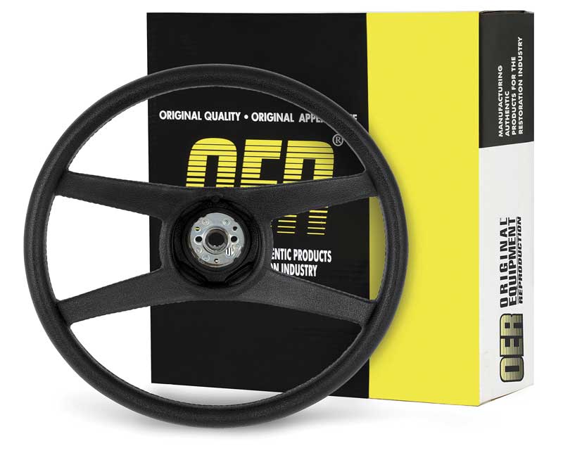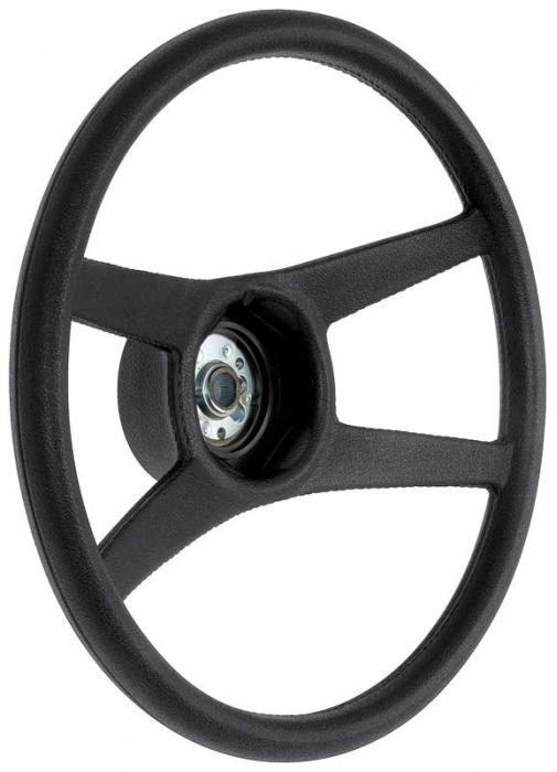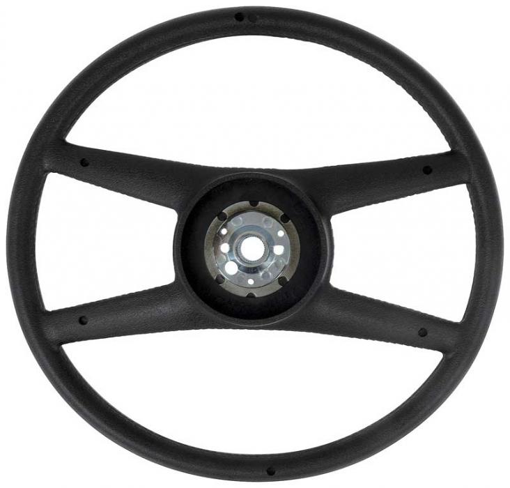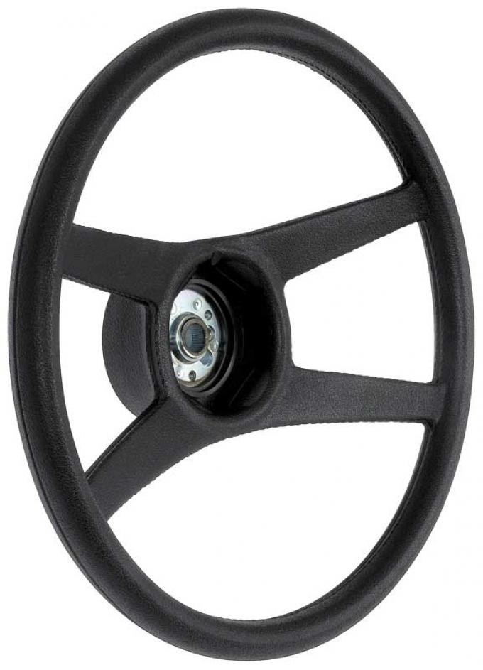 Reproduction of the original GM 4-spoke Sport steering wheel designed for use on various 1971-81 Chevrolet models with the NK4 steering wheel option. This quality reproduction 14-1/2" wheel features a soft black padding, original grain material, and a 4-spoke design as original. Each wheel is manufactured to exact specifications and will fit and install on the applications listed below. Steering wheel center cap and emblem available separately. Replaces GM part # 458998, 9752585.