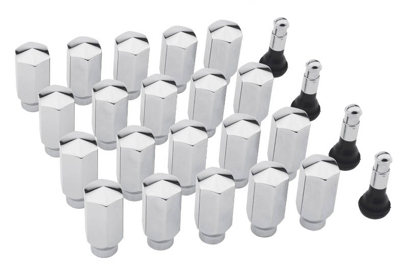 Chrome plated steel, these taller lugnuts are the same as originally equipped on 1967 & 1968 Shelbys. 1/2x20mm thread. Kit of 20, includes chrome valvestems
