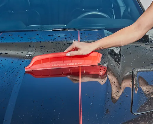 The California Jelly Blade's V-Blade design has exceptional contouring and flexibility to easily remove 90% of standing water in less than 1/3 the time of a towel or chamois, without scratching or streaking. Made from medical-grade silicone this blade is far superior to any other blade on the market. Features include easy to use ergonomic handle, special “extender” end for hard-to reach areas and “detailer” blade for side view mirrors and fog lights. It's clearly the world's most efficient car drying tool.