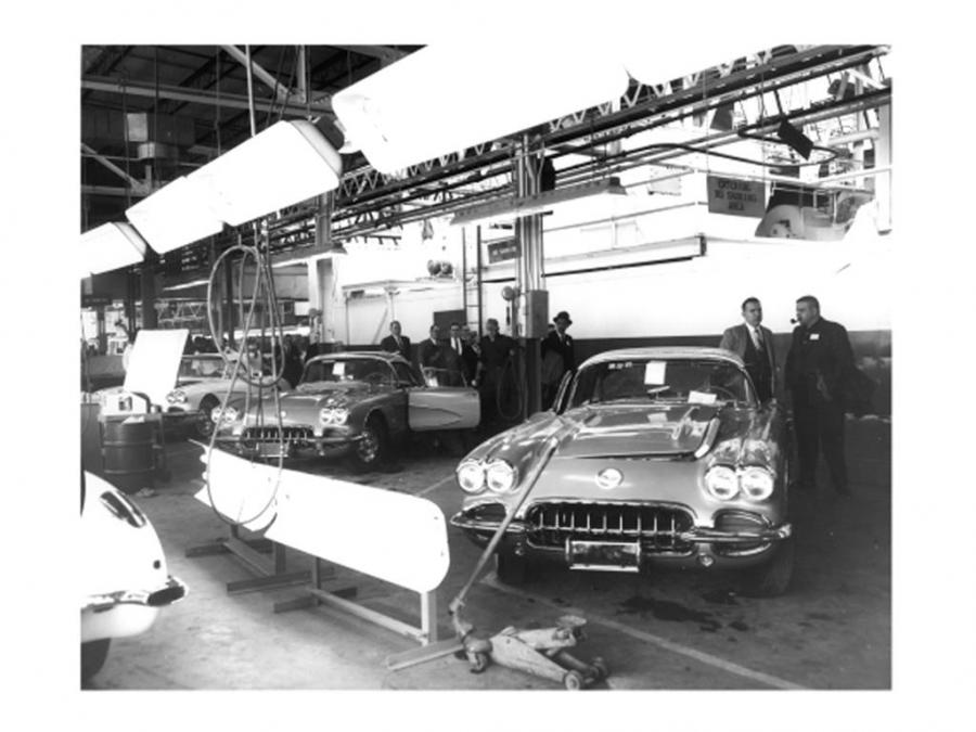 Photographer Alvin Sievers was invited to photograph the St. Louis Corvette plant. This black and white image shows everything from Corvette Club tours, Shriner's Tour to social events at the club.