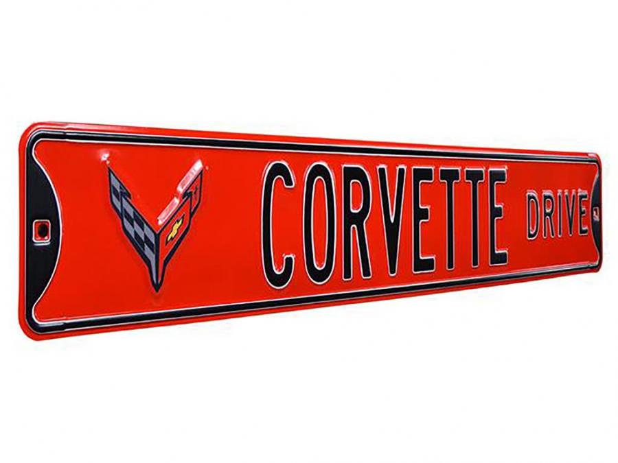 Liven up any street corner or garage wall, man cave, or office with this quality embossed metal C8 Corvette StreetSign. Measures: 36" x 6".