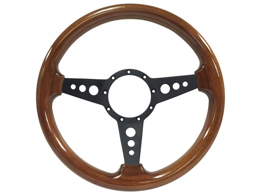 This S9 kit comes in walnut finish wood grip option with polished aluminum anodized center finish. It features a 14 in. diameter with a 2 in. depth for turn signal clearance. The grip thickness is 1.25 in. The Kit includes: hub adapter, C4 emblem, horn button, hardware and contact wire.