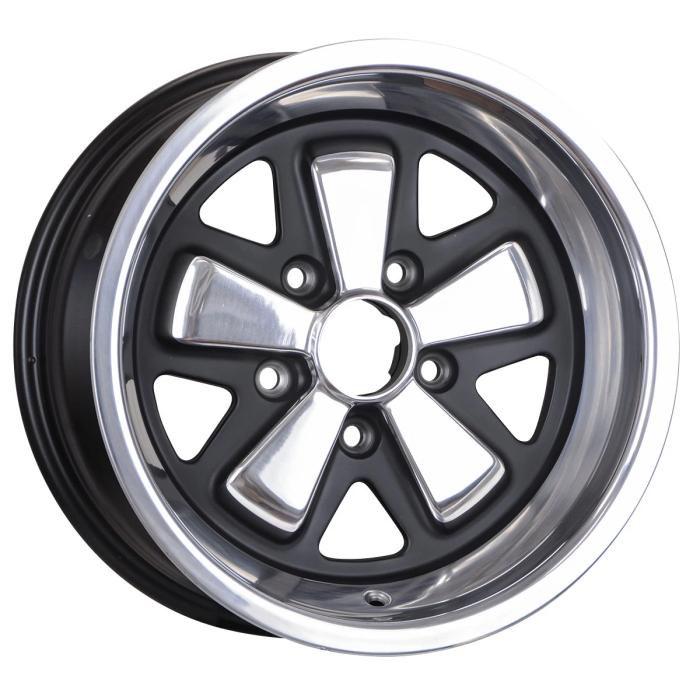 This Fuchs Style Wheel offers direct fitment for vintage Porsche 944, 911 SC, 911 Carrera, 924 Carrera GT and 911 Turbo from 1972 through 1989. The 16x8 inch sizing and +10mm offset fits nicely in the stock wheel wells. The bolt pattern is 5x130mm. The wheel features a one piece cast aluminum construction and a combination of polished aluminum and black details.