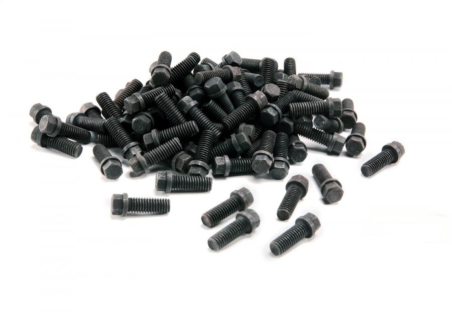 Designed for make header installation easier and heat-treated for extra strength. The special washer faced, smaller-than-standard hex head is for tight spaces. These bolts are Grade 5 with a 7/16 hex head and a protective black finish, except where noted. Bulk Packaged -100 pieces. 3/8 inch-16 x 1 inch.