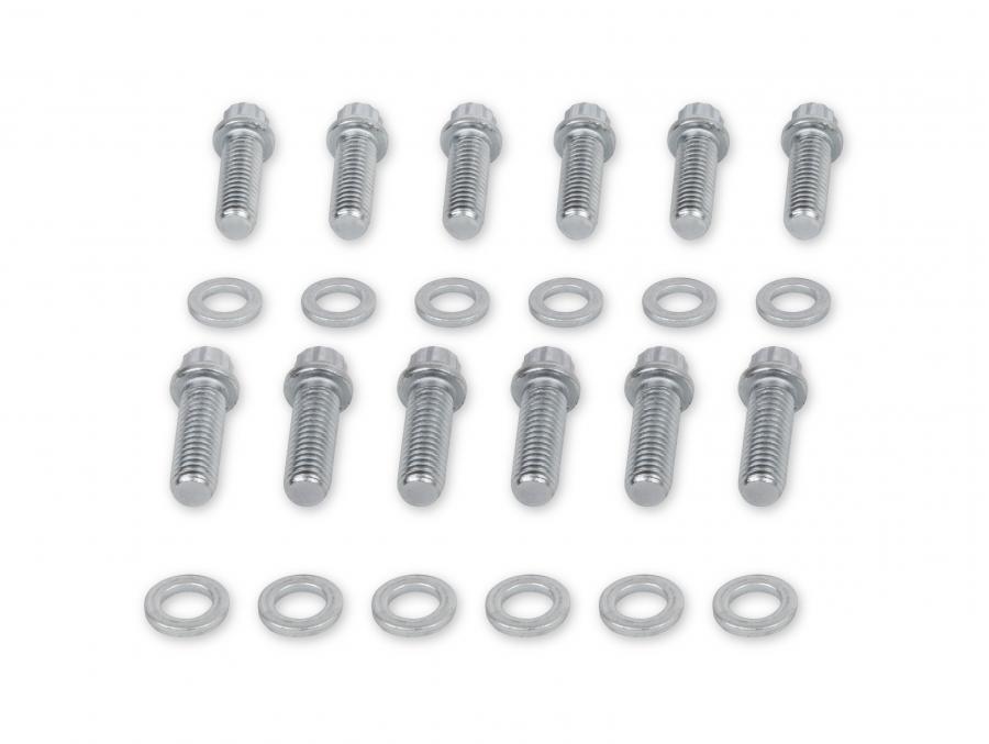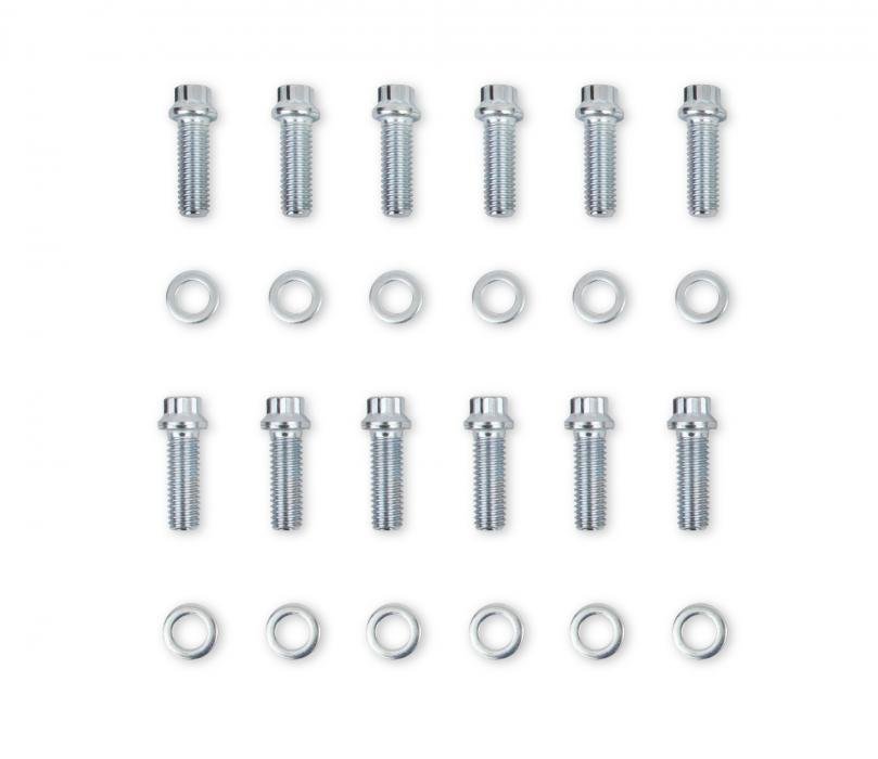 These special Grade 8 intake manifold bolts feature a 12-point smaller-than-standard head and flange, and include special extra thick flat washers for optimum clamping pressures. They're ideal for use where space is minimal, typical on larger runner race manifolds. These bolts and washers are bright zinc plated for protection and good looks.