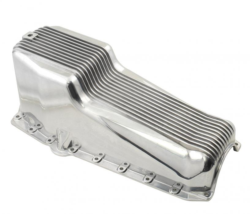 This fully polished, finned aluminum oil pan is die-cast for a perfect fit. 5 quart capacity. Drain plug & bolts included.