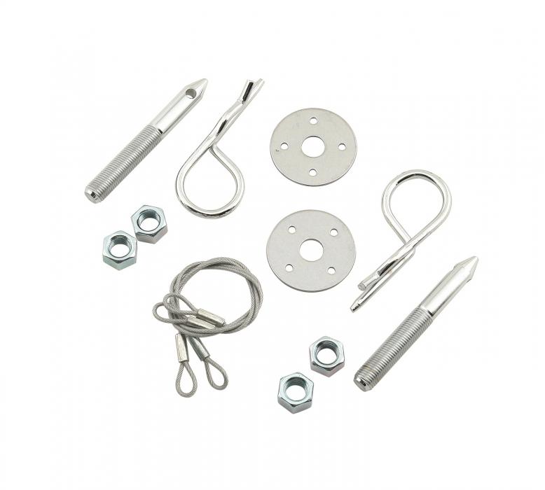 This chrome plated steel hood pin kit is perfect for your oval track application. Designed specifically to help keep pit time to a minimum. The kit has shorter lanyards, and smaller tapered pins for faster hood alignment. The 1-1/2 inch scuff plates prevent scratching.