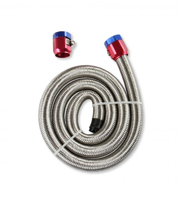 This fuel line will fit on any standard 3/8 inch hose barb in any carbureted fuel system. Sized at 3/8 inch i.d. (inner diameter) x 3 foot. Comes in handy just about anywhere fuel line is needed. Universal in design and very flexible, this fuel line can be used anywhere! Works great as transfer line from your hard fuel line to fuel pump or from pump up to the fuel filter or carburetor. 3' fuel line features a flexible rubber 3/8 inch i.d. (inner diameter) hose, covered with a steel braided jacket with bright anodized red & blue clamp covers on each end. This hose section of 36 inch can be cut to any size needed & works on all gasoline applications, such as lawn mowers, tractors, go carts, snow blowers, motorcycles, cars & trucks that are not fuel injected.