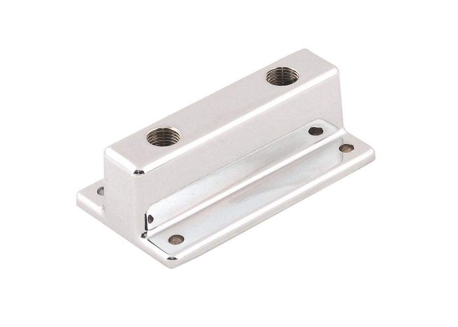 Dual Outlet. The classic inchT inch design for today's needs. These are precision die-cast, chrome plated blocks, ideal for plumbing tri-power set-ups, dual inlet Holley's with nitrous or any combination requiring multiple fuel distribution. Minimum restriction is assured with 3/8 inch diameter NPT tapped inlet and 1/4 inch diameter NPT tapped outlets. Four corner holes and screws are provided for easy installation.