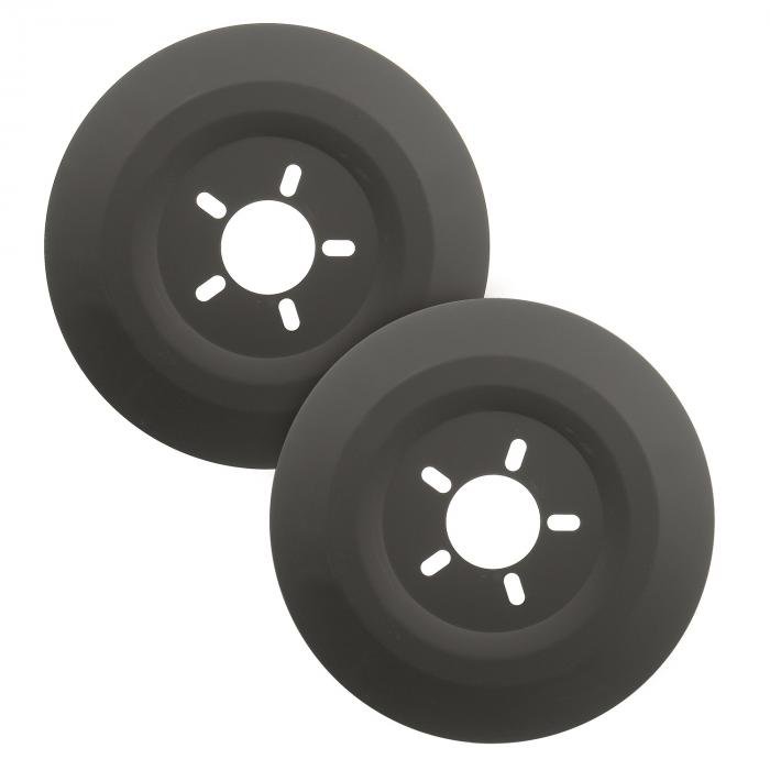 Brake dust doesn't just make your wheels dirty, it can actually harm the finish or even the metal depending on the compound of your pads. These black aluminum dust shields are designed to both to reduce brake dust, but also conceal unsightly weathered brake components. These shields are ideal for use on most domestic and import rear wheel drive cars with alloy or custom wheels. Universal in design, they are formed from a high quality, black aluminum, and can be painted to color coordinate with vehicle. Very simple to install, just place them over your wheel studs then install your wheels. Wheel Dust Shields are available to fit most 14, 15, and 16 inch diameter wheels, and are packaged two per set. Will not fit front wheel drive applications.
