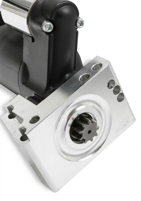 MSD's DynaForce Starters feature all new components beginning with a three horsepower motor. This power is used to crank over the reduced 4.4:1 gear set to deliver great torque to the engine's ring gear to get the engine turning. The compact housing clears most headers and oil pans, but just in case, we made the billet mount so it can be clocked in different positions to help in tight applications. The assembly is powder coated black and will stay looking good, even though it's underneath your car.