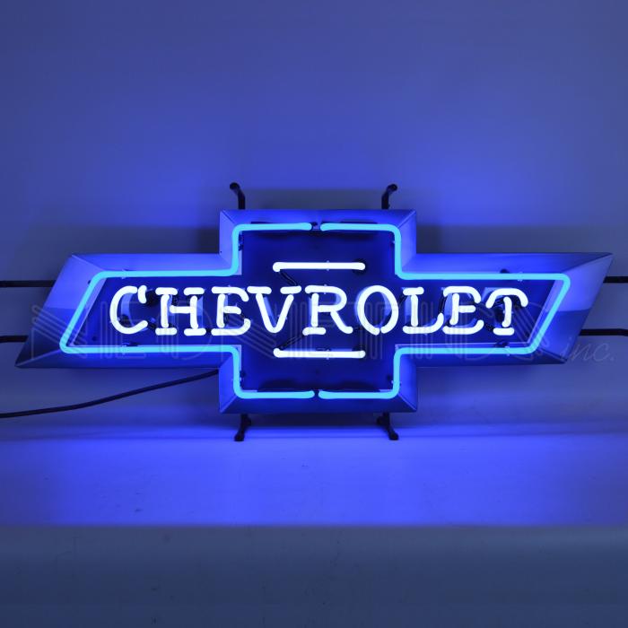 Neonetics Neon Signs feature multi-colored, hand blown neon tubing. The Chevrolet Bowtie neon sign has blue and white neon tubes, and measures 37 inches wide by 14 inches tall. The glass tubes are backed by a beautiful full-color image, and the entire sign is supported by a black finished metal grid. The sign can be hung against a wall or window; they can even sit on a shelf. Neonetics neon signs have a warm mesmerizing glow, and are powered by industrial strength transformers, which operate silently and more efficiently than incandescent bulbs. All you do is hang it up and plug it in – no assembly or special wiring required. Fully licensed by General Motors through Neonetics Inc. For Indoor use only.