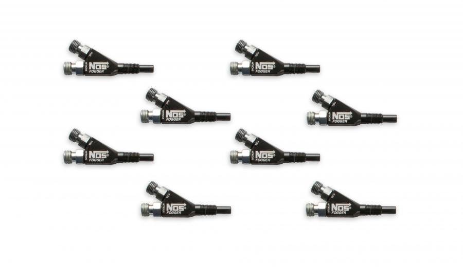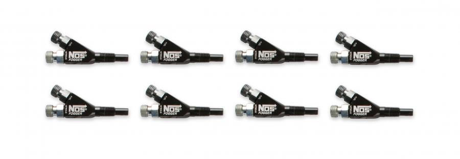 8-Pack of Fogger2™ Nozzles, Standard - The original, patented NOS Fogger™ nozzle revolutionized the way nitrous oxide and fuel were dispersed into an engine. And to this day, there's nothing better than it for a variety of applications. However, as engine displacements got bigger, cylinder head designs got better and camshafts technology advanced, it became evident that greater precision was needed and NOS developed the Fogger2™ nozzle. Its unique flow design provide superior atomization of supplemental fuel as well as more even fuel distribution within the nitrous flow than other nozzles. Changing power levels takes only seconds and is simply a matter of changing the fuel and nitrous jets on the nozzle. Both the original Fogger and Fogger2™ nozzles are made from brass and have a black finish. They feature an etched NOS logo and tags for fuel and N20 identification during installation or jet changes. Note: For alcohol applications, please call our Technical Support Department at 270-781-9741