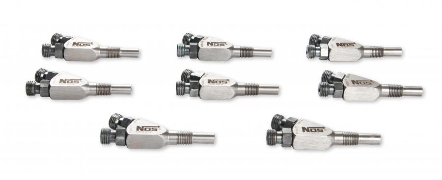 8-Pack Annular Discharge Fogger Nozzle (Stainless Steel) - NOS has done it again! The stainless steel Annular Discharge nozzle is the most effective design in the world, The Annular Discharge Fogger® nozzle's secret lies in specially engineered annular orifices which mix the nitrous and fuel in a radial pattern outside the nozzle tip to provide superior atomization of supplemental fuel as well as more even fuel distribution within the nitrous flow. This new nozzle design produces an even tighter "cone" of nitrous oxide/fuel mixture and provides more precise control of nitrous/fuel ratios throughout the jetting spectrum. It is important to note that the Annular Discharge nozzle shoots out straight, and as such is NOT a direct replacement for the standard Fogger™ or Fogger® 2 nozzles. It is designed to be fitted to the manifold at a very tight angle (much closer to 30° than the normal 90° -but entirely dependent on runner design). Because of the way the Annular Discharge nozzle can be installed, it does not protrude into the intake tract and disrupt flow. The nozzles are made of stainless steel for superior durability.