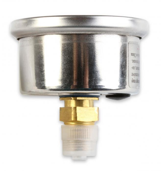 Blue and black face nitrous gauges with easy-to-see color graduations and a white pointer. Gauges have a stainless steel case with brass internals. Gauges are available individually or in a gauge kit that included the gauge with a in-line gauge adapter. All connection fittings are 1/8" NPT