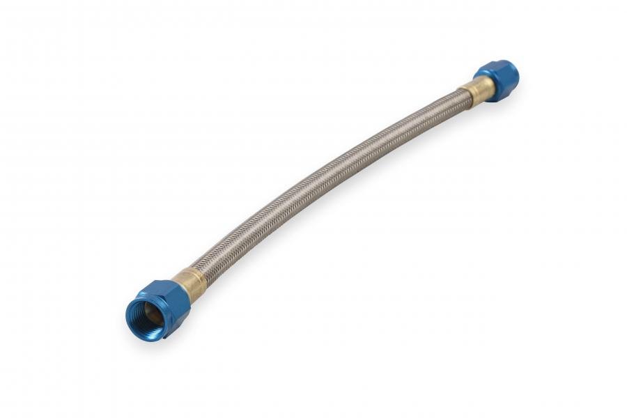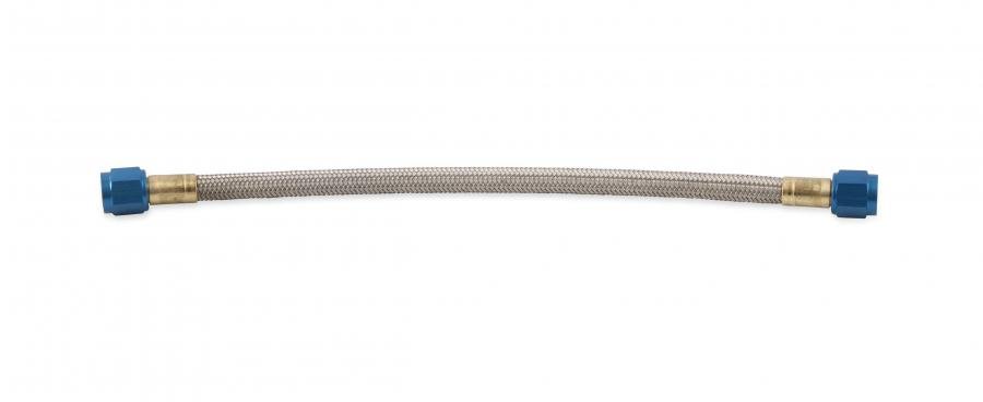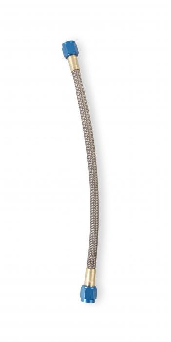 -6AN 1-foot Blue Please see catalog page for different lengths. - NOS premium grade stainless steel braided hoses come with -3, -4, -6 and -8 AN fittings (including step-ups) in virtually any length. They are all PTFE lined to withstand high pressures and provide high flow with a stainless steel outer covering for strength and resistance to abrasion. All NOS lines are configured for a superior flow to strength ratio. The AN fittings are color coded for identification: blue (for nitrous) or red (for fuel).