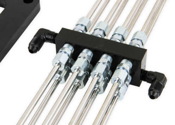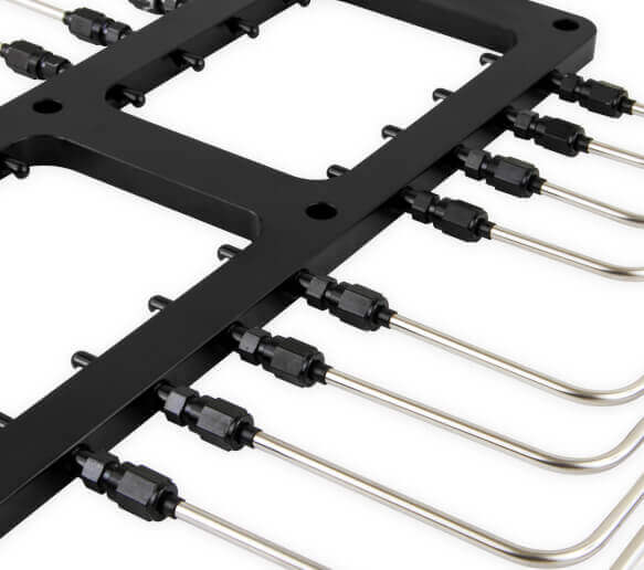 • Includes ½ inch thick low profile design black anodized aluminum plate offering excellent nitrous and fuel distribution and black bottle kit